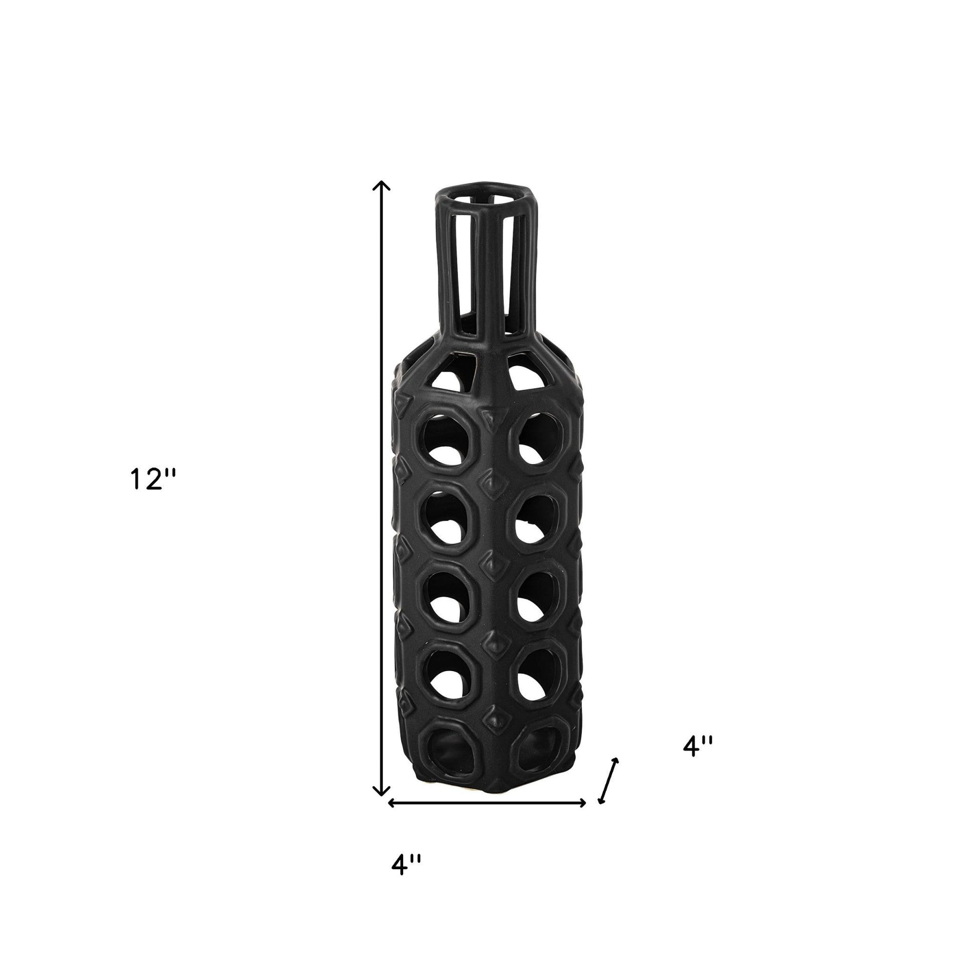 Add a unique touch of decor to any space in your home with this Black Pierced Pattern Ceramic Vase. This vase is made from ceramic and has a stunning semi-matte black finish on it. The base of the vase has a narrow domed shape with circular shapes cut out. These circular shapes get smaller as they move up the body of the vase. There are small diamond details in between these shapes. The top has a thin wire design and resembles the look of bottle neck. This vase is unique yet neutral and will look great with any colors or decor styles you already have. Display live or artificial flowers in it or just use it as it is. 12" H x 4" W x 4" D